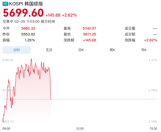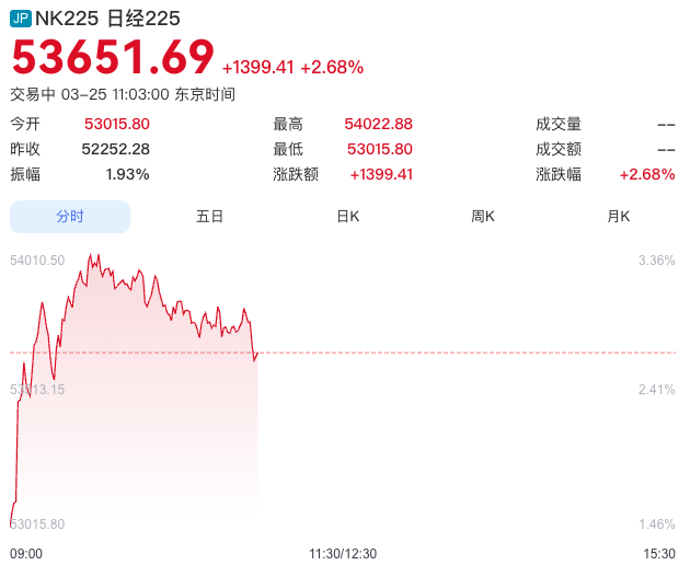 3月25日,日韩股市高开,扫尾发稿,日经225指数涨2.68%,现报53651.点。韩国KOSPI指数涨2.62%,现报5699.6点。